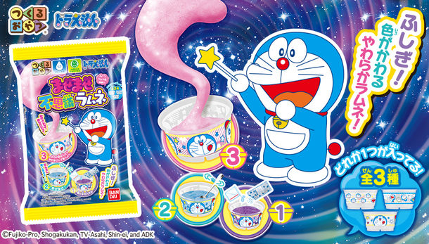 藤子・F・不二雄原作によるアニメ「ドラえもん」とバンダイのお菓子作成キット「つくるおやつ」シリーズのコラボによる「ドラえもん まぜまぜ不思議ラムネ」が発売された。