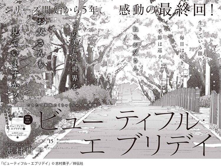 志村貴子が描く義兄妹ラブ「ビューティフル・エブリデイ」FYで完結、次号に高野ひと深 2021年5月8日2021年5月8日 editor 「ビューティフル・エブリデイ」扉ページ志村貴子「ビューティフル・エブリデイ」が、本日5月8日発売のフィール・ヤング6月号(祥伝社)で最終回を迎えた。 「ビューティフル・エブリデイ」は親同士の再婚で、ひとつ屋根の下で暮らすことになった思春期の男女を描くシリーズ連載。エロマンガ家の娘・花琳と、そんな彼女に恋した義兄・光一らの人間模様が描かれる。最終3巻は夏頃に発売予定だ。 なお6月8日発売の次号7月号より、「私の少年」の高野ひと深による新連載「ジーンブライド」がスタートする。 関連記事アニメ「よう実」2年生編、2026年4月放送開始 新1年生6人のキャスト発表 「東島ライダー」トーナメント編のビジュアル 編集版の上映会に小西克幸も駆けつける舞台「セラピーゲーム」静真に湊が触れるキービジュアル 新キャストになだぎ武ら深い教養がありそうだけれども…ライトにいろんなことを楽しむ「ニセ教養お姉さん」「ヴィジランテ」“相澤過去編”の冒頭2話、少年ジャンプ+で1週間限定の無料公開頑張れ緑谷出久!「ヒロアカ」最後の戦いに向けたビジュアル キャスト陣の生配信も Tweet 関連コミック ビューティフル・エブリデイ 私の少年 ジーンブライド