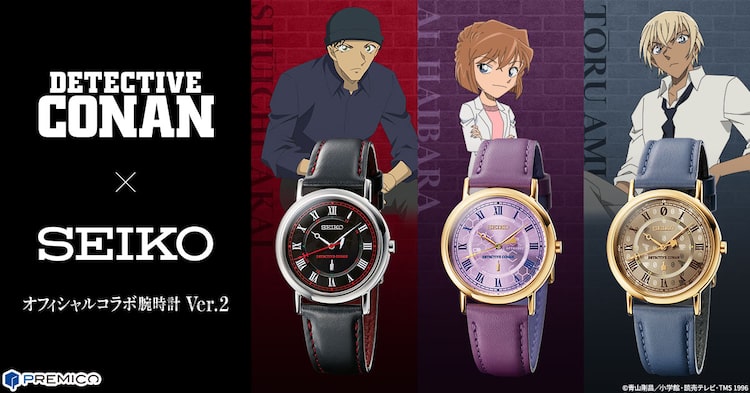 青山剛昌原作によるアニメ「名探偵コナン」に登場する赤井秀一、灰原哀、安室透をイメージしたセイコーの腕時計が登場。本日5月19日よりPREMICOオンラインショップにて、それぞれ2020点限定で予約販売されている。