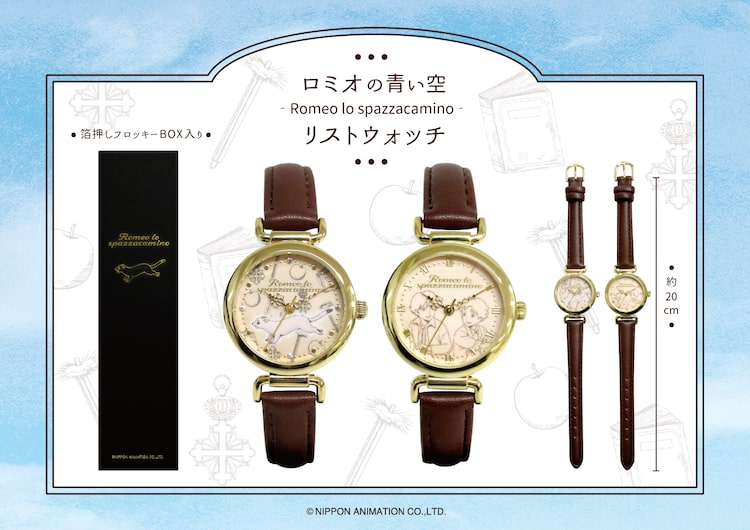 「ロミオの青い空」走るピッコロ、微笑み合うロミオ&アルフレドをデザインした腕時計 2021年5月23日2021年5月23日 editor 「ロミオの青い空リストウォッチ」告知ビジュアルアニメ「ロミオの青い空」をモチーフにした腕時計が、7月に発売される。 文字盤はピッコロが描かれたA柄、ロミオとアルフレドがデザインされたB柄の2種類。A柄は時間を表す部分にクリスタルガラスのストーンがあしらわれ、B柄は数字の部分が立体的に表現されている。ベルベット素材の専用ボックスに入れられ、価格は税込各5500円。予約はYahoo!ショッピングの商品ページで受け付けている。 (c)NIPPON ANIMATION CO.,LTD 関連記事「みなみけ」サントラ4枚をデジタル配信、明日11月1日より全シリーズ無料公開「シャフト50周年展」まほろや暦が加わりビジュアル完成、「化物語」トークショーも開催「メダロット」&「メダロットS」トークショーに山崎みちる、竹内順子らが登壇アニメ「監獄学園」10周年記念イベントに神谷浩史、小西克幸ら男子キャスト5人勢揃い京都アニメーション、2026年新作タイトルの発表を10月25日に生配信YouTubeで30作以上のアニメ厳選エピソードや第1話を期間限定公開、明日は「ジョジョ」 Tweet