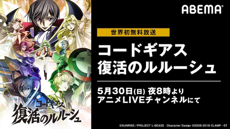 劇場アニメ「コードギアス 復活のルルーシュ」が、5月30日と31日にABEMAのアニメLIVEチャンネルで無料放送される。