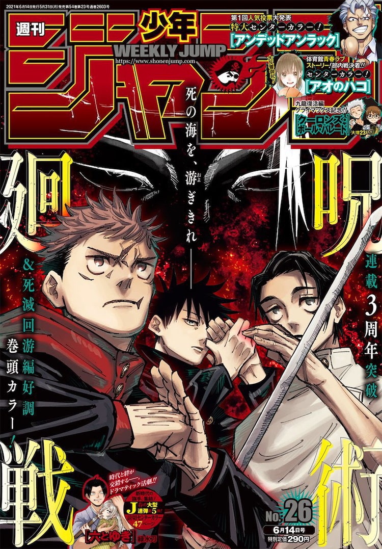 本日5月31日に発売された週刊少年ジャンプ26号(集英社)では、芥見下々「呪術廻戦」が連載3周年突破を記念して表紙と巻頭カラーで登場。第2回キャラクター人気投票実施の告知も行われている。