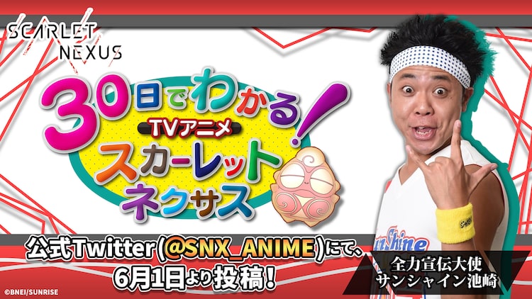 TVアニメ「SCARLET NEXUS(スカーレットネクサス)」の“全力宣伝大使”にサンシャイン池崎が就任。明日6月1日より、池崎が出演するミニ番組「30日でわかる! TVアニメ スカーレットネクサス」がスタートする。