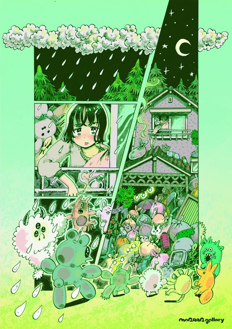 会場では「庭と侵略者」をテーマに、40枚の原稿用紙に描かれたマンガ風のモノクロイラストが展示される。またmograg galleryと広島のシルクプリントアーティスト・HARO WORKSHOPによるレギュラーコラボ企画「LowBrow Branch」の一環として、Tシャツとポスターを販売。6月11日にKADOKAWAのビームコミックスから発売される単行本「教室の片隅で青春がはじまる」も会期初日から先行販売され、30冊限定で直筆サイン入りイラストが付属する。特典はなくなり次第終了のため、詳細は会場にて確認を。
