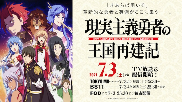 「現実主義勇者の王国再建記」は勇者として異世界に召喚された主人公ソーマ・カズヤが、窮地にあるエルフリーデン王国の財政と政治を立て直していく“異世界内政ファンタジー”。なおアニメは地上波放送と同時刻の7月3日25時半よりFODでも独占配信される。