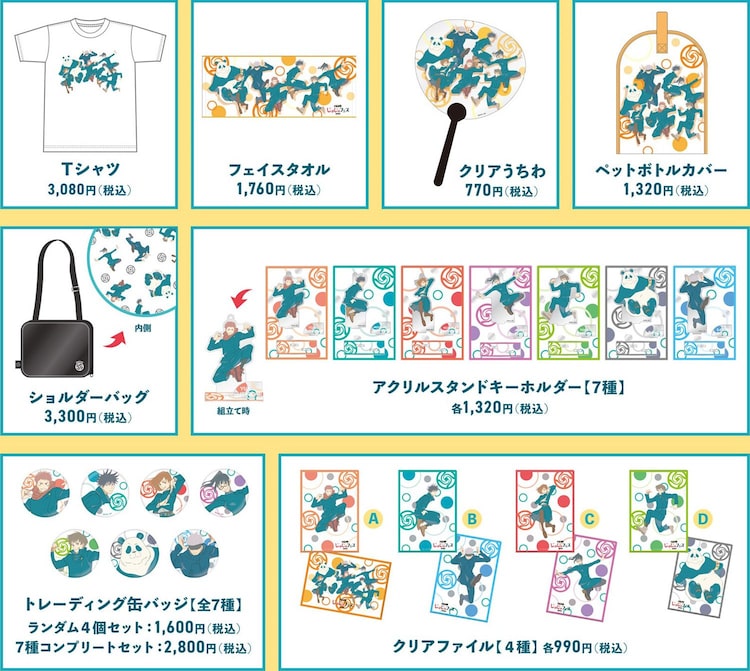 イベントグッズにはTシャツ、フェイスタオル、クリアうちわ、ペットボトルカバー、ショルダーバッグ、アクリルキーホルダー、トレーディング缶バッジ、クリアファイルをラインナップ。「アニメじゅじゅさんぽ」のテイストで描かれた虎杖、伏黒、釘崎、禪院、狗巻、パンダ、五条のイラストがデザインされた。