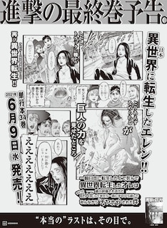 諫山が描き下ろしたのは、34巻の内容を告知する1ページマンガ。これまで単行本の巻末で諫山が続けてきた予告マンガの集大成とも言える内容となっている。