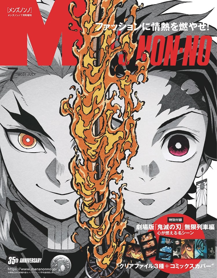 MEN’S NON-NO7月号増刊の表紙には炭治郎と煉獄がモノクロで登場。付録として「劇場版『鬼滅の刃』無限列車編」で描かれる名シーンをデザインしたファイル3種と、単行本カバーの4点セットが用意される。MAQUIA8月号増刊の表紙には炭治郎、禰豆子、煉獄の3人を美しい花々とともに配置。SPUR8月号では表紙に手を取り合う炭治郎、禰豆子、煉獄がサイケデリックな柄とともに描かれ、同イラストを使用したクリアファイルも付属する。MORE8月号増刊の表紙では映画の中でも描かれた、炭治郎と杏寿郎が眠っている場面を再現。付録ではリッチ感あるハードカバーの「柱集合ノートBOOK」が展開された。