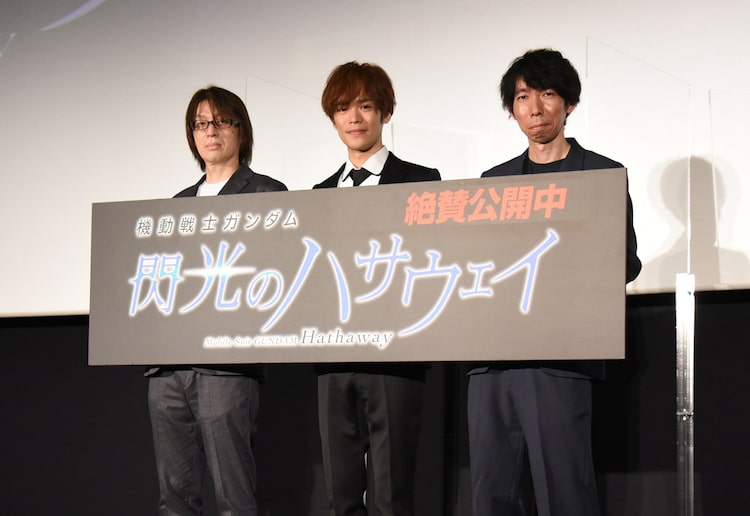 劇場版「機動戦士ガンダム 閃光のハサウェイ」の公開を記念した舞台挨拶が、本日6月13日に東京・丸の内ピカデリードルビーシネマで開催され、ハサウェイ・ノア役の小野賢章、村瀬修功監督、プロデューサーの小形尚弘が登壇した。