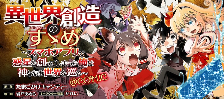 たまごかけキャンディー原作による岩戸あきらの新連載「異世界創造のすゝめ~スマホアプリで惑星を創ってしまった俺は神となり世界を巡る~@COMIC」が、本日6月14日にTOブックスのcomicコロナで開始した。小説を原作としたコミカライズ作品だ。