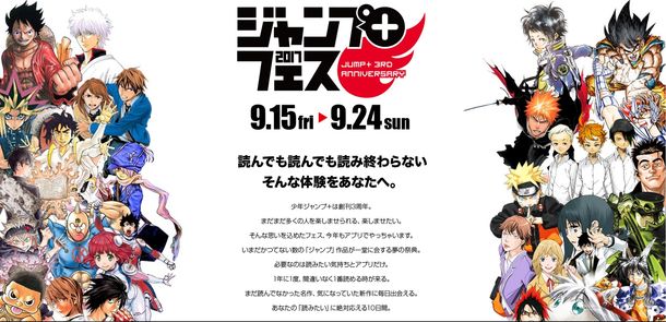 少年ジャンプ+が9月22日に創刊3周年を迎えることを記念し、本日9月15日から24日までの計10日間、週刊少年ジャンプ、ジャンプスクエア(ともに集英社)や少年ジャンプ+のタイトルを無料で公開する「ジャンプ+フェス2017」が行われる。