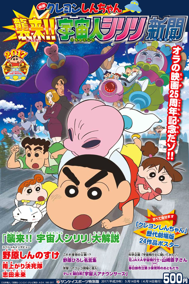 「クレヨンしんちゃん 襲来!! 宇宙人シリリ新聞」は全32ページのタブロイド判。ゲスト声優の雨上がり決死隊や志田未来へのインタビューが収録されるほか、テレビ朝日系アナウンサーによるアフレコ現場レポートも掲載。また宇宙人が登場する同映画になぞらえ、元宇宙飛行士の山崎直子が幼稚園児の質問に答える企画ページも。歴代劇場版24作品のポスターも一挙掲載される。発売店舗は全国の上映館、一部店舗を除く主要コンビニ、アニメイトなど。サンスポe-shopでも注文を受け付ける。価格は500円。