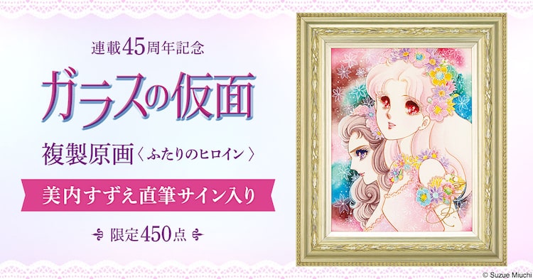 「ガラスの仮面」連載45周年を記念し、美内すずえの直筆サイン入り高精細複製原画が、通販サイトPREMICOオンラインショップにて450点限定で販売される。価格は税込9万8780円。