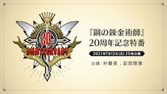 2001年7月12日発売の月刊少年ガンガン(スクウェア・エニックス)での連載開始から、ちょうど20年の節目を迎える7月12日に放送されるこの特番。アニメ版でエドを演じた朴ろ美、アルを演じた釘宮理恵が出演し、「鋼の錬金術師」の魅力や思い出を振り返る。アニバーサリーイヤーを祝うプレゼントキャンペーンなどさまざまな企画紹介に加え、初解禁情報の発表も行われる予定だ。