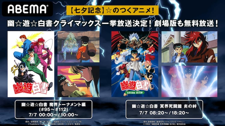 タイトルに「☆(星)」が付くことから、7月7日の七夕に合わせた特別企画として実施される今回の一挙放送。7日0時と10時より、魔界の王を決める戦いを描いた物語の最終章「魔界トーナメント編」を、7日8時20分と18時20分より、霊界を危機に陥れた冥界との戦いを描いた「劇場版『幽☆遊☆白書 冥界死闘篇 炎の絆』」を放送する。放送後も1週間は無料視聴が可能だ。