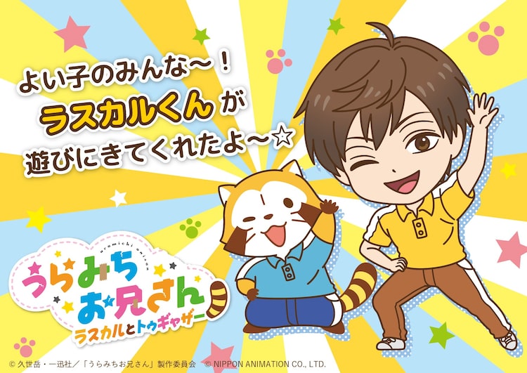 久世岳原作によるTVアニメ「うらみちお兄さん」と、「あらいぐまラスカル」がコラボレート。描き下ろしイラストを使ったグッズが、7月9日よりマルイ3店舗を巡回するポップアップショップ「うらみちお兄さん in マルイ」にて販売される。