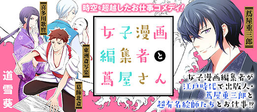 「女子漫画編集者と蔦屋さん」は、江戸時代にタイムスリップしてしまったマンガ編集者・鶴野千代子を描くファンタジー4コマ。祖父の家で江戸時代に流行したマンガの原点・黄表紙を手にした千代子は、気が付くと江戸時代にタイムスリップしていた。そこで出版人の蔦屋重三郎と出会った千代子は、彼の元で働くことに。葛飾北斎、喜多川歌麿、東洲斎写楽ら大物浮世絵師たちと仕事をすることになり、興奮する千代子だが……。ゼロサムオンラインでは2話まで公開中。