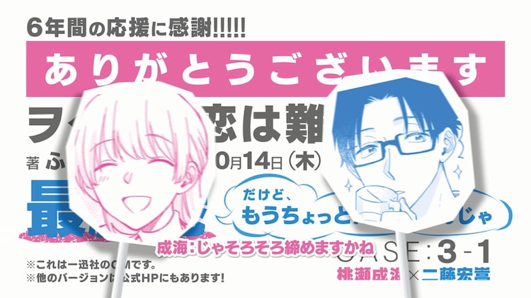 また「ヲタ恋」の最終回を記念したCMがYouTubeにて公開に。CMは桃瀬成海と二藤宏嵩、小柳花子と樺倉太郎、二藤尚哉と桜城光の3パターンが用意され、各キャラクターたちがファンへの感謝の気持ちを伝えている。