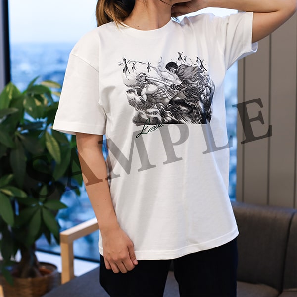 Tシャツはリヴァイがジークに刃を突きつける20巻第81話の一コマを切り取ったものと、エレンが超大型巨人のうなじめがけて剣を振りかぶる20巻第82話のワンシーンをあしらったものの2種類。またTシャツと併せて、アクリルスタンドとメタルバッジがセットになったグッズも、エレンとリヴァイの2種類がお目見えした。価格はTシャツが税込各3300円、「アクリルスタンド&メタルバッジセット」が税込各2200円。