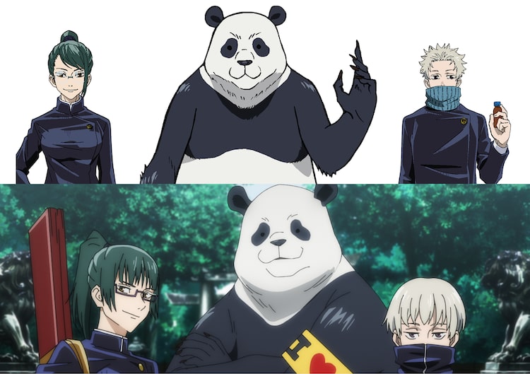 TVアニメシリーズでは東京都立呪術高等専門学校の頼れる2年生として登場し、「劇場版 呪術廻戦 0」では乙骨憂太の同級生として1年生時の姿が描かれる真希、棘、パンダ。真希はTVアニメシリーズからヘアスタイルやトレードマークの眼鏡が変わっている。狗巻は原作からヘアスタイルが変化しており、芥見からの希望を反映して、アニメスタッフが仕上げた。