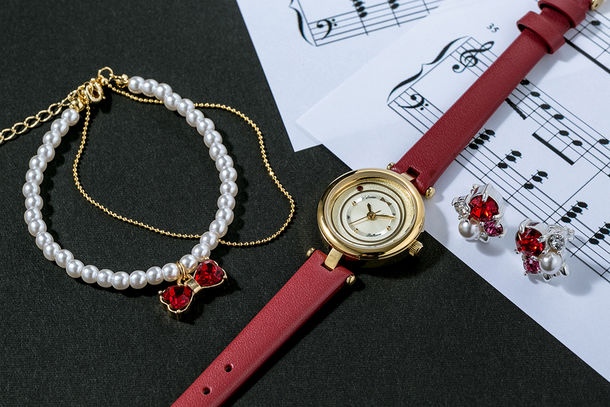このたび登場したアイテムは、富士田多々良モデル、兵藤清春モデル、赤城賀寿モデル、仙石要モデルの腕時計、ブレスレット、ピアス、イヤリング。多々良モデルはレッド、清春モデルはブルー、賀寿モデルはイエロー、仙石モデルはグリーンをベースに、蝶ネクタイモチーフが映えるデザインに。シンプルで普段使いしやすいアイテムに仕上がった。