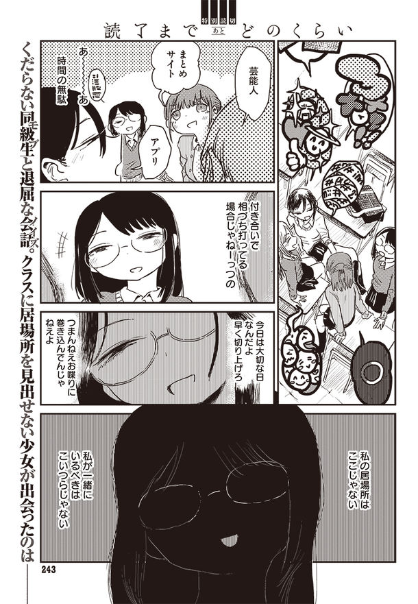 「読了まであとどのくらい」はクラスに居場所を見出せない読書好きの女子高生・はるかが、楽しみにしていた作家の新刊を購入するため、書店を訪れる場面からスタート。新刊が売り切れており落ち込むはるかは、最後の1冊を購入したのが書店で働く女性店員の難波であると知る。難波に対しいい印象を抱かなかったはるかだが、本の話をするうちに彼女に興味を持ちはじめ……。
