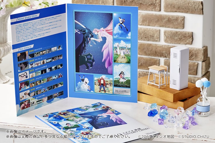 「メタリックアートコレクション スタジオ地図10周年記念」は「時をかける少女」「サマーウォーズ」「おおかみこどもの雨と雪」「バケモノの子」「未来のミライ」、そして上映中の「竜とそばかすの姫」のビジュアルをブリキに印刷し、ブックレットに挟み込んだアイテム。ブックレットにはスタジオ地図作品を象徴する入道雲や青空をベースに、6作品の場面写真がデザインされている。