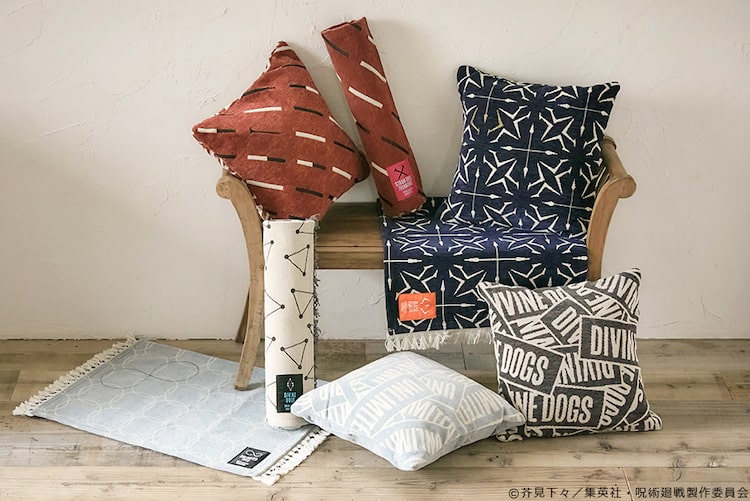 ラインナップされたのは虎杖悠仁、伏黒恵、釘崎野薔薇、五条悟をイメージしたクッションカバーとミニラグ。虎杖と肉体を共有する特級呪物・宿儺や、伏黒の式神である玉犬の額の模様、釘崎の術式・芻霊呪法「簪」をモチーフにした釘マーク、五条の術式順転「蒼」、術式反転「赫」、虚式「茈」をイメージした正円などがシェニール織でデザインされている。