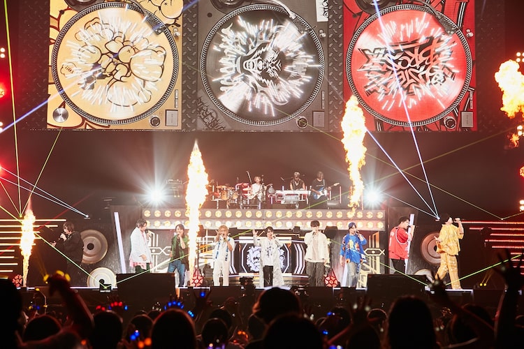 続いて、各ディビジョンのソロ楽曲が披露されるシークエンスに。オオサカ・ディビジョン“どついたれ本舗”はCreepy Nutsが制作した関西弁が印象的な「あゝオオサカ dreamin’night」、シブヤ・ディビジョン“Fling Posse”は詩的でエモーショナルな「Stella」、ナゴヤ・ディビジョン“Bad Ass Temple”は名古屋出身のnobodyknows+が手がけた「Bad Ass Temple Funky Sounds」を披露する。続くヨコハマ・ディビジョン“MAD TRIGGER CREW”が「シノギ(Dead Pools)」をパフォーマンスすると、碧棺左馬刻役の浅沼晋太郎は会場に向けて「この景色、これからも忘れねえよ」と呼びかける。イケブクロ・ディビジョン“Buster Bros!!!”はアカペラでラップをする「IKEBUKURO WEST GAME PARK」、シンジュク・ディビジョン“麻天狼”は押韻の魅力を曲に詰め込んだ「Shinjuku Style ~笑わすな~」を歌唱し、それぞれのディビジョンの持つ特性とオリジナリティを発揮した。