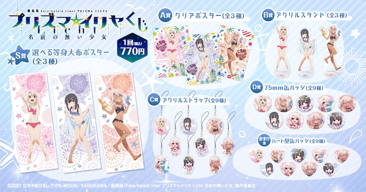 くじの商品には水着を着たイリヤ、美遊、クロエの描き下ろしイラストやミニキャライラストを使用。S賞には等身大の布ポスター、A賞にはクリアポスター、B賞にはアクリルスタンド、C賞にはアクリルストラップ、D賞には缶バッジがラインナップされた。