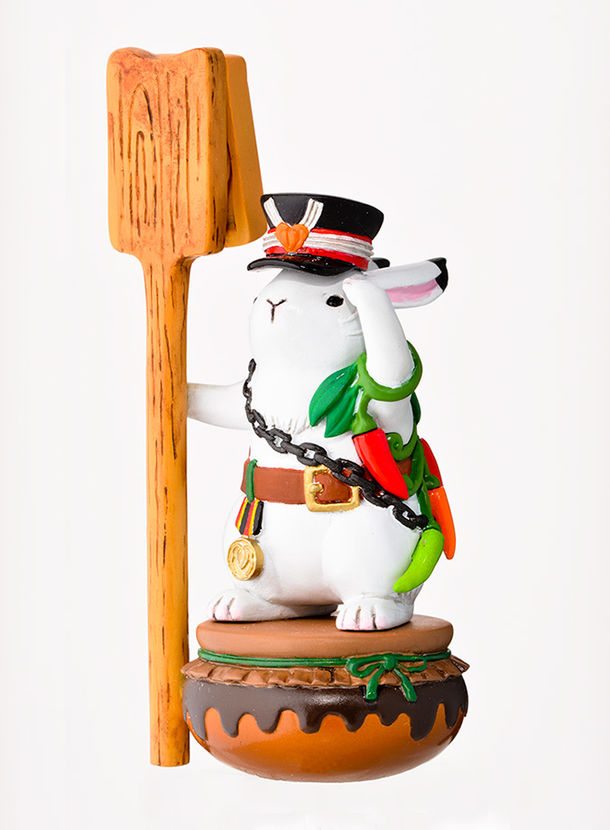 かちかち山の狸に恨みを抱く兎の獄卒・芥子。呵責(かしゃく)に使う櫂の部分で名刺、メモ、ポストカードなどを挟むかわいらしいスタンドだ。限定版にはさらに、江口の描き下ろしポストカードも封入された。