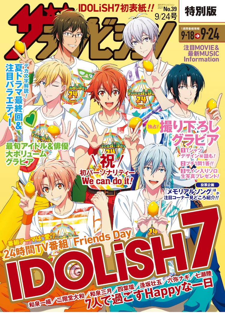 24時間生放送されるチャリティ番組「Friends Day」のパーソナリティに初めて就任した記念という設定で、週刊ザテレビジョンに初登場したIDOLiSH7。誌面では表紙と同じくレモンを持ったグラビアに加え、Tシャツデザインの裏話や、共演する先輩アイドルからのアドバイスについて明かすインタビューが展開された。