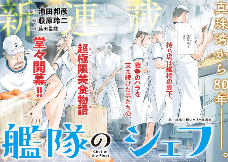 戦場の男たちの食を支えるハードボイルドグルメマンガ「艦隊のシェフ」モーニング新連載 2021年9月22日2021年9月22日 editor 「艦隊のシェフ」扉ページ池田邦彦原作による萩原玲二の新連載「艦隊のシェフ」が、本日9月22日発売のモーニング43号(講談社)にてスタートした。 「艦隊のシェフ」は、第二次世界大戦中、常に最前線にいた駆逐艦・幸風を舞台にしたグルメマンガ。戦場へ向かう兵士ために食事を作り続ける“めしたき兵”たちの物語が描かれる。 関連記事「猫と竜」猫に育てられた猫竜役は子安武人、ティザーPV公開 2026年7月放送開始「鎧伝サムライトルーパー」5人の素顔が垣間見える新映像、凱と上杉魁人が衝突押山清高監督主催の「ルックバック展」展示内容が明らかに、チケット販売は本日から「夢幻紳士」×「超人ロック」のコラボイベント、「夢幻ロックBAR」期間限定オープン「鬼滅の刃」無限城編、入場者特典第10弾は蛇腹ポストカードセット大友克洋「MEMORIES」リバイバル上映記念、30年前に発売されたパンフレット復刻 Tweet 関連コミック 艦隊のシェフ