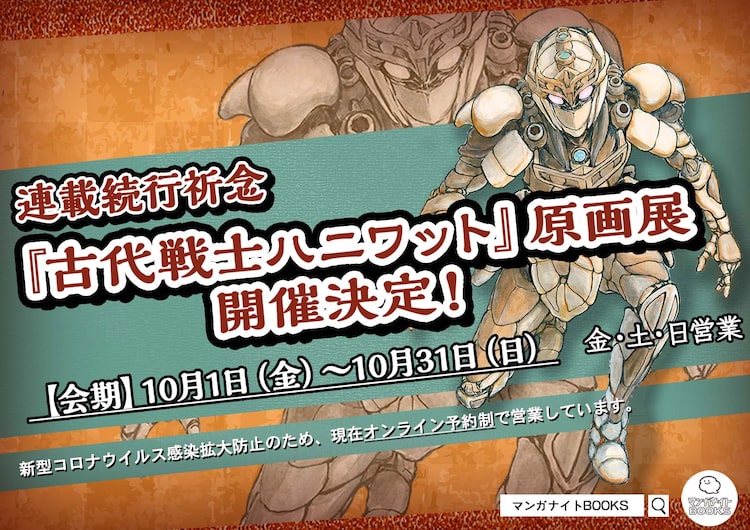 会場では「古代戦士ハニワット」を中心とした約50点の原画を展示するほか、オリジナルのポストカード、クリアファイル、複製原稿、アクリルスタンドを販売。会期中の金・土・日のみ3日ずつの営業となり、新型コロナウイルスの感染拡大防止のため予約制にて開催される。
