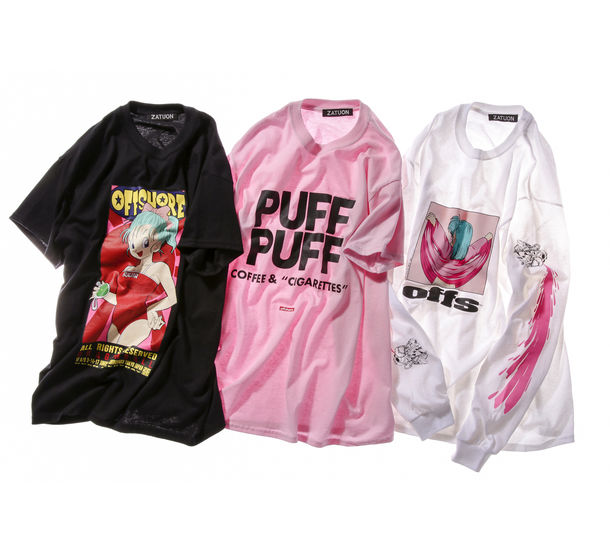 Tシャツはブルマをモチーフにした、「offs Tee」「PUFF PUFF Tee」「Poster Tee」の3タイプをラインナップ。「offs Tee」には服をたくし上げたブルマと、それを見た亀仙人のイラストがプリントされている。「PUFF PUFF Tee」はその商品名通り、「PUFF PUFF(ぱふぱふ)」の文字を大きくデザインした1枚。「Poster Tee」には水着を着用したブルマの描き下ろしイラストがあしらわれた。