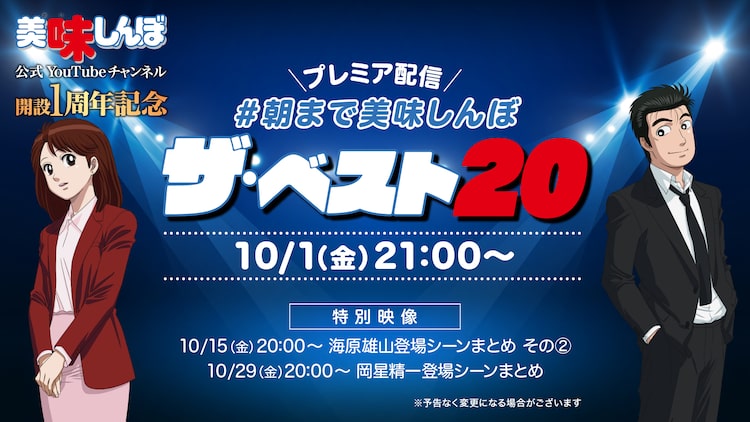 アニメ「美味しんぼ」のYouTube公式チャンネルが、10月1日に開設1周年を迎えることを記念して行われるこの企画。20話分のエピソードはチャンネル独自のデータ集計によって選出された。また10月15日20時からは「海原雄山登場シーンまとめ」の第2弾、29日20時からは「美味しんぼキャラクター総選挙」で見事第2位に輝いた「岡星精一登場シーンまとめ」がプレミア公開される。