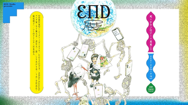 研究プロジェクト・HITE-Mediaが主催する同展は、「死」をテーマとしたさまざまな問いを来場者に投げかけ、「死」からテクノロジーと社会の未来を問う企画展。「死」の物語と向き合うヒントとして、描き下ろしの短編マンガ、HITE-Mediaが選んだマンガ作品の1コマ、気鋭のアーティストたちの作品を展示し、これから社会変化と人間の関係を考える場を提案する。展覧会の開催に先立ち、学校法人角川ドワンゴ学園N高等学校、S高等学校、N中等部との共同企画を実施。中高生たちと「死」をテーマにディスカッションを行い、そこで生まれたさまざまなコメントを展示に取り入れる。