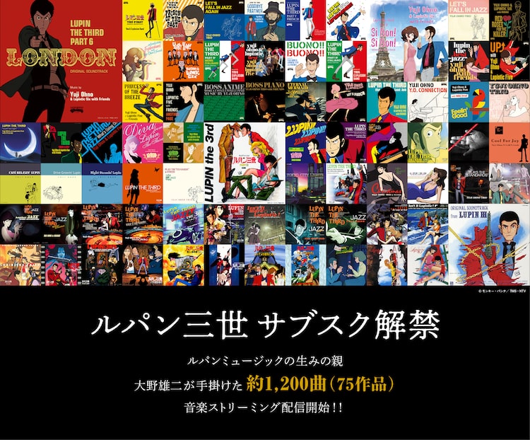 モンキー・パンチ原作によるアニメ「ルパン三世」の関連楽曲約1200曲のストリーミング配信が、Spotify、Apple Music、Amazon Musicなどの各サービスで本日10月8日にスタートした。