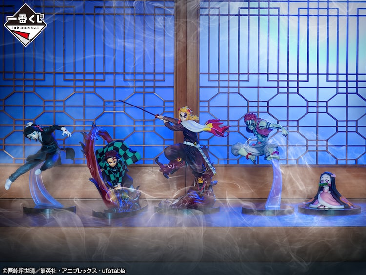 「一番くじ 鬼滅の刃 ~刃を振るい心を燃やせ~」には、全9等級39種のアイテムを用意。A賞からF賞にはフィギュアがラインナップされ、一番くじでは初となる「ヒノカミ神楽」を使う炭治郎、一番くじで初立体化となる魘夢、小さくなったかわいらしい姿の禰豆子、「炎の呼吸」を使う煉獄、躍動感あふれたポーズの猗窩座などが揃えられた。