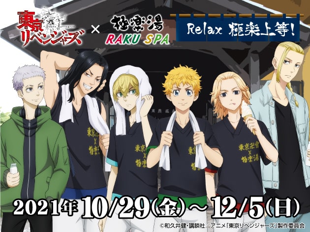 和久井健原作によるTVアニメ「東京リベンジャーズ」と入浴施設・極楽湯およびRAKU SPAがコラボレート。キャンペーン「Relax 極楽上等!」が10月29日から12月5日にかけて、19店舗で開催される。