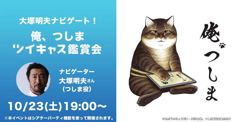 おぷうのきょうだい原作によるアニメ「俺、つしま」のオンライン鑑賞会「大塚明夫ナビゲート!俺、つしまツイキャス鑑賞会」の開催が決定。10月23日19時より、ライブ配信プラットフォーム・ツイキャスで行われる。
