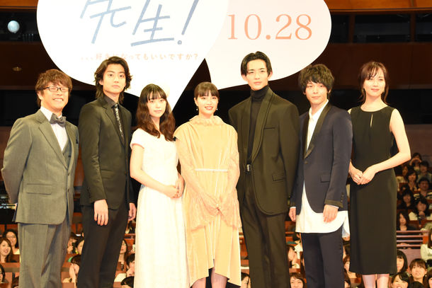 映画「先生! 、、、好きになってもいいですか?」の完成披露イベント。左から監督の三木孝浩、キャストの健太郎、森川葵、広瀬すず、竜星涼、中村倫也、比嘉愛未。 (c)河原和音/集英社 (c)2017 映画「先生!」製作委員会