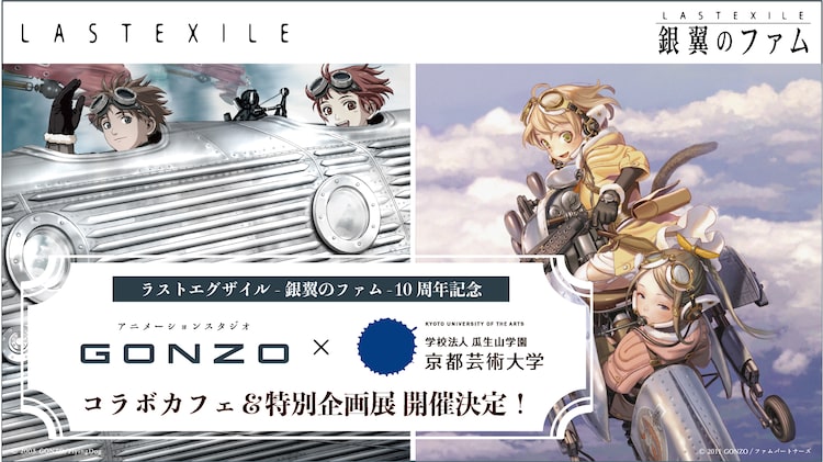 「ラストエグザイル-銀翼のファム」のアニメーション制作を務めたGONZOと京都芸術大学がこれまで行なってきた、産学連携の一環として実施されるこのイベント。カフェでは作中に出てきた料理の再現メニューや、作品の世界観をイメージしたメニューとして「ディーオのお手製パンケーキ」「ルシオラとの思い出ライチソーダ」「みんなの美味しいポテパン」「テディのお給仕キッシュ」などが提供される。またコラボメニューの注文特典も用意。アクリルコースター全12種からランダムでプレゼントされる。