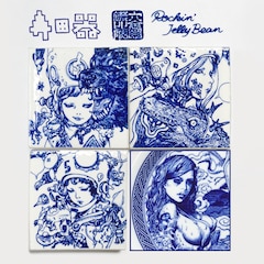「寺田器」は長崎を産地とする波佐見焼の陶器を中心に、「寺田克也の器」というテーマでさまざまなグッズを展開するプロジェクト。2017年に第1弾の販売がスタートし、今年で5年目となる。今シーズンでは、覆面画家のRockin’Jelly Beanとのコラボアイテムも用意。寺田とRockin’Jelly Beanの「限定シルクスクリーン」各1種、Rockin’Jelly Beanの「6寸皿」、新作の「蕎麦猪口セット」、内装などへの実用ほかコースターとしてや観賞用としても楽しめる「えタイル」3種、イラスト集「MHzine004」といった商品が会場では販売される。