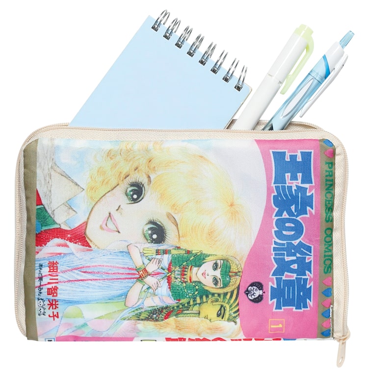 「コミックポーチコレクション」でラインナップされたのは、「王家の紋章」の単行本の表紙を模したポーチ。1~10巻の10種類が用意され、ポーチの内側には各巻の印象的なシーンがプリントされている。またポーチは縦に約18cmほどの大きさで、内側にゴムバンドが付属しているので、単行本を収めてブックカバーとして使用することも可能だ。