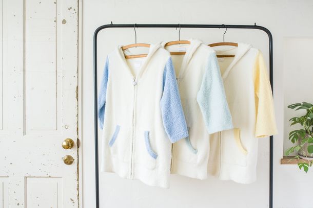 ルームウェア第2弾は、ゆったりとしたジップアップタイプのパーカーを用意。ホワイトをベースに、勝生勇利モデルは落ち着いたブルー、ヴィクトル・ニキフォロフモデルは大人っぽいライトブルー、ユーリ・プリセツキーモデルは爽やかなレモンイエローが配色された。