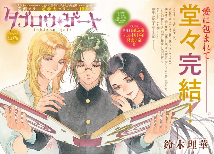 足かけ20年にわたり発表されてきた「タブロウ・ゲート」は、不思議なタロット画集“タブレット”から逃げ出した住人・タブロウたちを回収する少年少女の冒険を描いたゴシックファンタジー。最終回は102ページの大ボリュームで展開された。また今号には完結を記念し、着せ替えカバー2種セットが付属。カバーは単行本1巻と2022年1月14日に発売予定の最終26巻にそれぞれ使用できる。