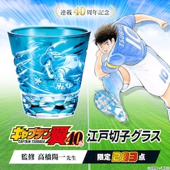 原作者の高橋による監修のもと、職人によって1点1点手作りされた「キャプテン翼 連載40周年記念 江戸切子グラス」。大空をイメージした青い色被せガラスを使用した本体には、シュートを放つ大空翼の勇ましい姿がサンドブラストで描かれた。翼の放つボールの軌道や背面に描かれた優勝カップの輝きは、江戸切子の代表的文様である「菊繋ぎ」によって表現。グラス下部にはサッカーボールの五角形をイメージした柄があしらわれた。グラスの底にはキャプテン翼40周年記念ロゴとエディションナンバーが刻まれている。