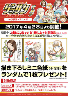 Read Moreゲッサン(小学館)のフェアが、4月28日より全国の文教堂・アニメガにて開催される。 期間中、文教堂・アニメガにて対象の書籍を1冊以上と、対象商品を一会計で税抜き1000円以上購入した人には特典を進呈。「からかい上手の高木…