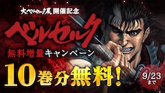 Read More三浦建太郎「ベルセルク」のキャンペーンを、明日9月1日から23日にかけて白泉社のアプリ・マンガParkが実施。単行本10巻までに相当する104チャプターが無料になるほか、アプリ内のストアで「『ベルセルク』スペシャル編集版…
